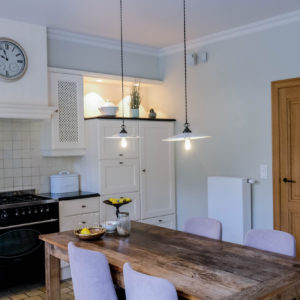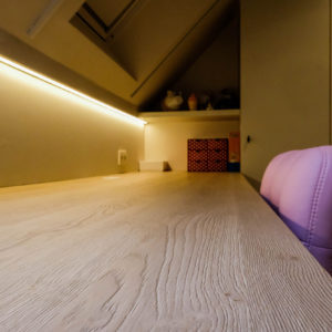 Ook binnenshuis gingen we op een creatieve manier om met de verlichting. Zo werd er in de kinderkamers vooral gewerkt met indirecte verlichting. Zo is de bureau voorzien van een ledstrip, waardoor het wel lijkt alsof deze zweeft. Over de volledige bovenverdieping is gedacht aan de veiligheid als het donker is. De nachtverlichting in de kamers, de gang en de trappenhal begeleiden de bewoners zo ’s nachts veilig naar bijvoorbeeld het toilet.