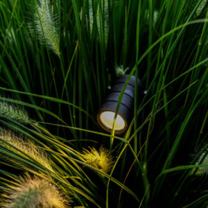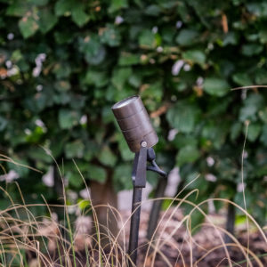 Wanneer de zon ondergaat, schakelt de tuinverlichting automatisch aan. De bomen, planten en struiken lichten op en maken deze landelijke tuin uiterst gezellig om in te vertoeven. We kozen voor koperen Quinn grondpinnen die zeer slank zijn van design. Op die manier vallen ze helemaal niet op tussen het groengewas en dat maakt het plaatje des te mooier.